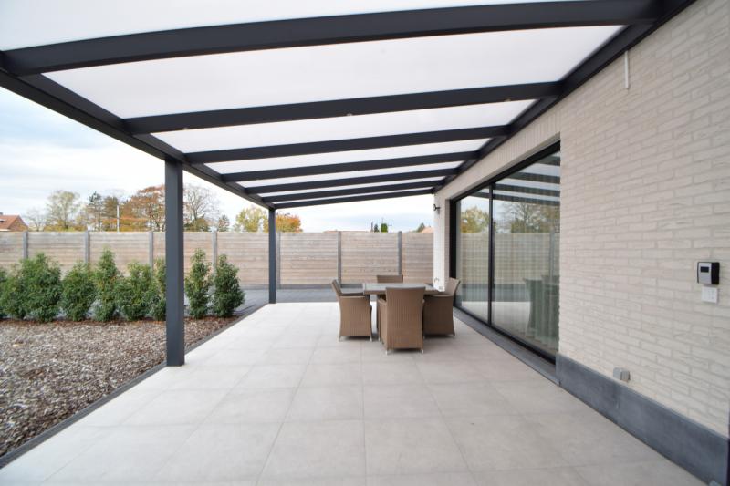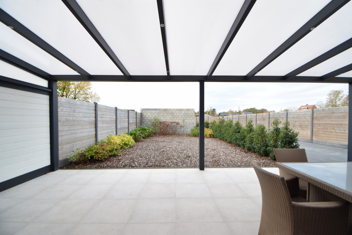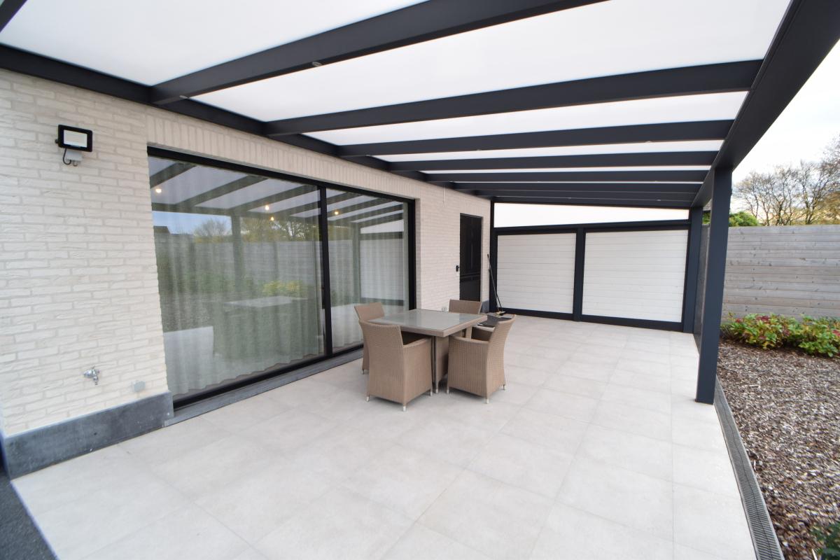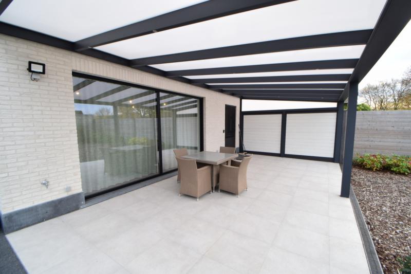 De leefruimte geeft via een deur en schuifraam uit op een groot overdekt terras achteraan.