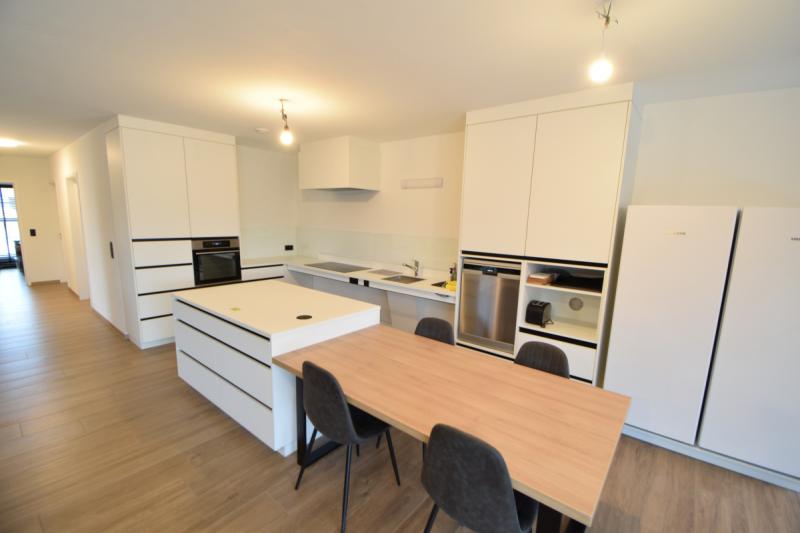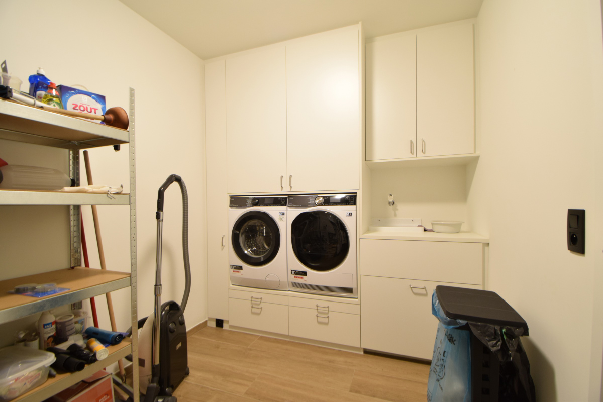 De leefruimte achteraan bestaat uit een grote leefruimte bestaande uit een zit- en eethoek en een open keuken met eiland. De keuken is eveneens aangepast voor rolstoelgebruikers met een elektisch verstelbaar aanrecht, vaatwasser op hoogte, … .