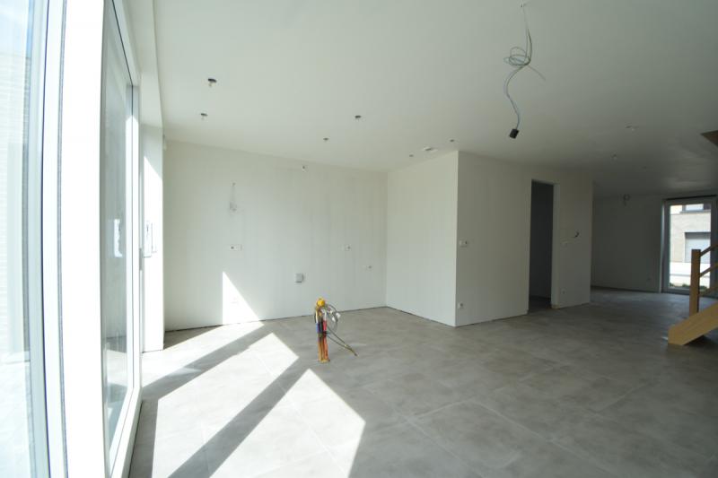 Indeling: inkomhal met gastentoilet en deur naar de garage en berging. De inkomhal geeft uit op een leefruimte bestaande uit een zithoek vooraan en een eethoek achteraan met volledig geďnstalleerde open keuken.De leefruimte geeft via een schuifraam uit op het terras en de tuin achteraan. In de leefruimte staat een open trap naar de 1ste verdieping.