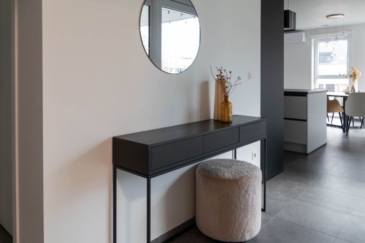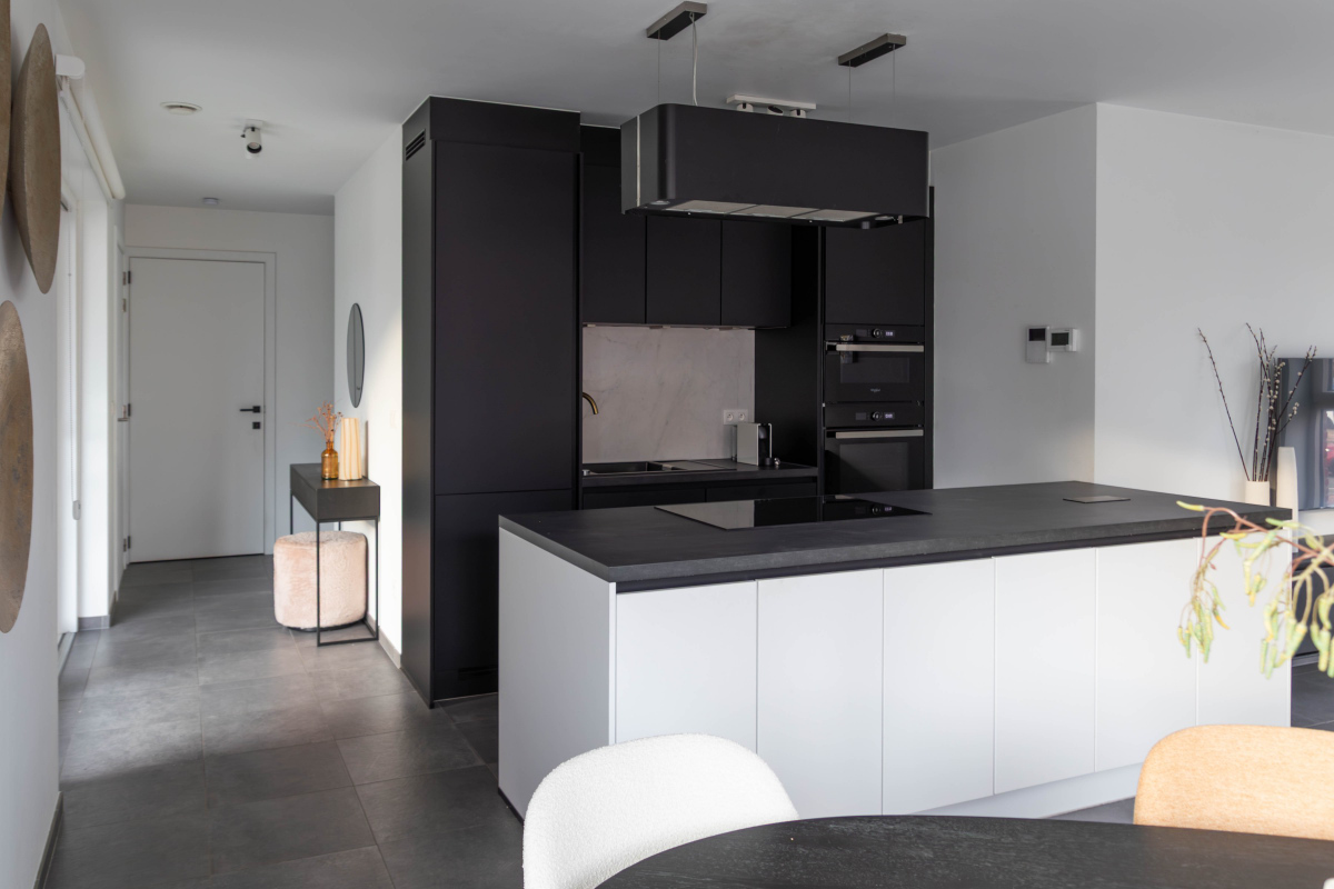 De inkomhal leidt naar een leefruimte met veel lichtinval en een mooi open zicht op de Onze-Lieve-Vrouwkerk. Aansluitend bevindt zich de volledig uitgeruste open keuken met kwalitatieve toestellen (inductiekookplaat, spoelbak, koelkast, diepvries, combi-oven, vaatwasser, …). Via het schuifraam bereikt u het aangename, overdekte terras waar u het hele jaar door kan genieten.