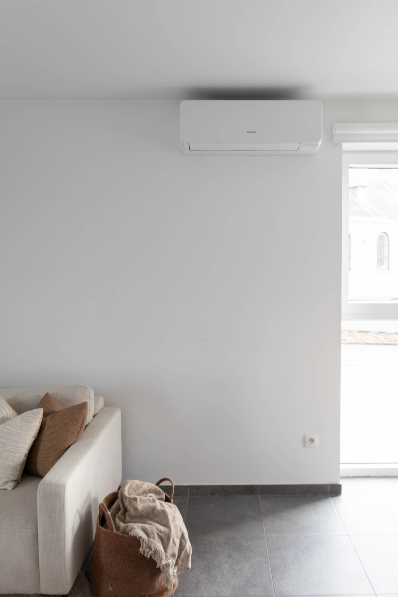 Naast de vloerverwarming is de leefruimte uitgerust met een warmtepomp die zowel kan verwarmen als koelen.