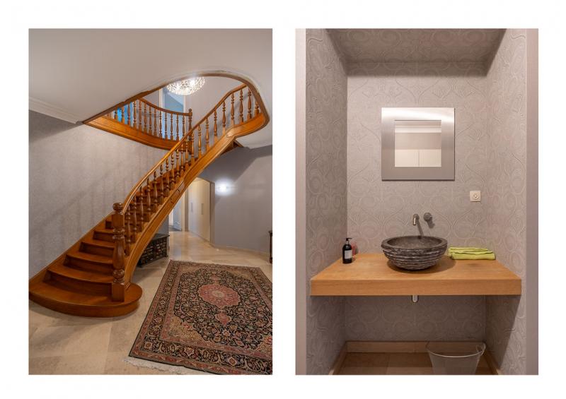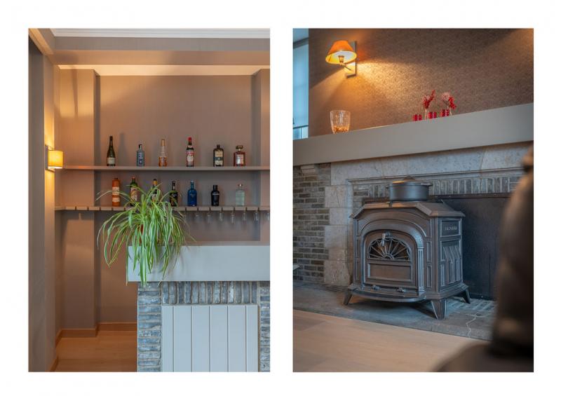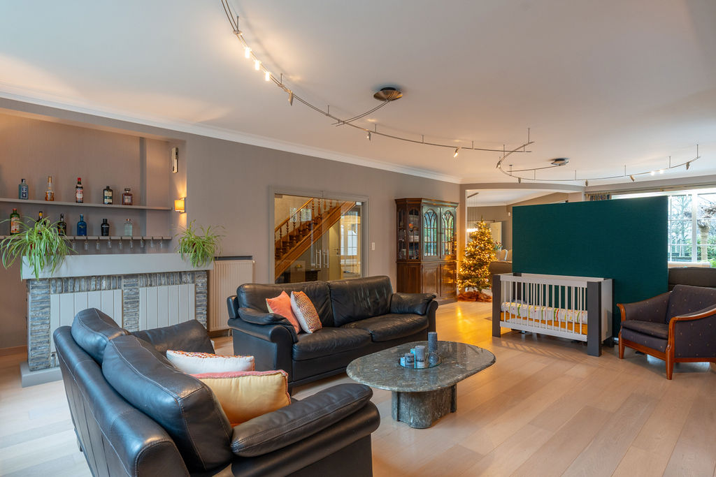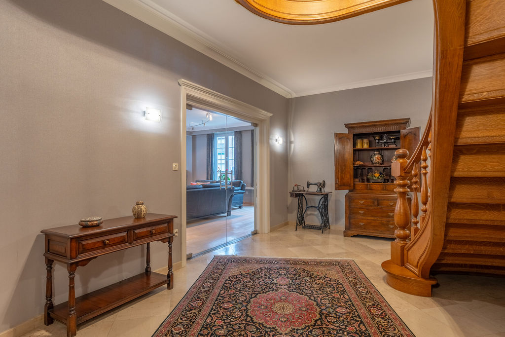 Bij het betreden van de villa wordt u verwelkomd in een imposante inkomhal die meteen indruk maakt met haar prachtige houten trap naar de bovenverdieping. Aanpalend is er een vestiaire en een gastentoilet met handenwasser. De inkomhal geeft uit op een ruime leefruimte bestaande uit zithoek met houtkachel en eetkamer die warmte en klasse uit stralen en is afgewerkt met massief parket, wat perfect aansluit bij het authentieke karakter van de woning.