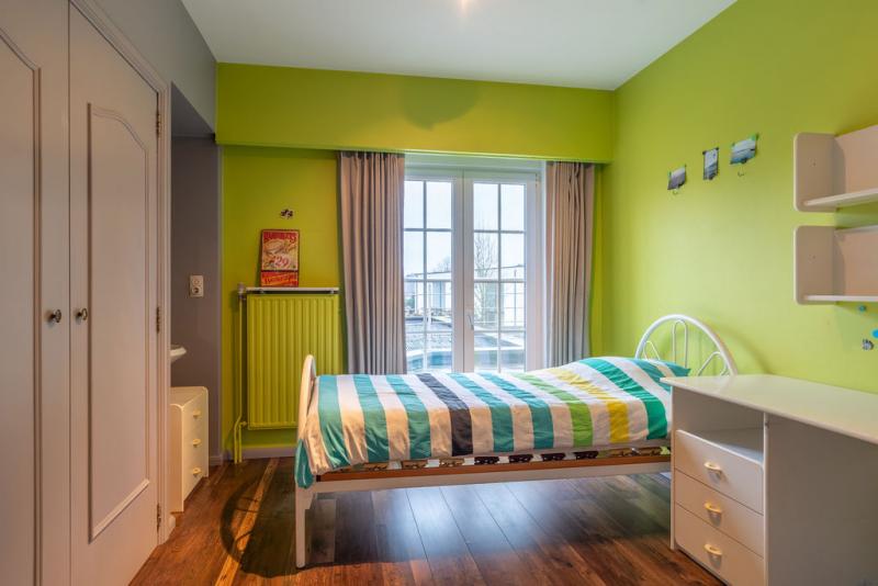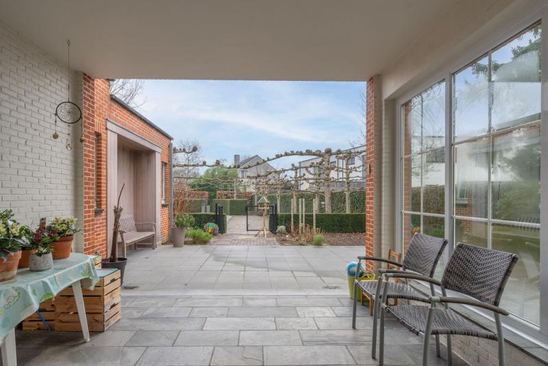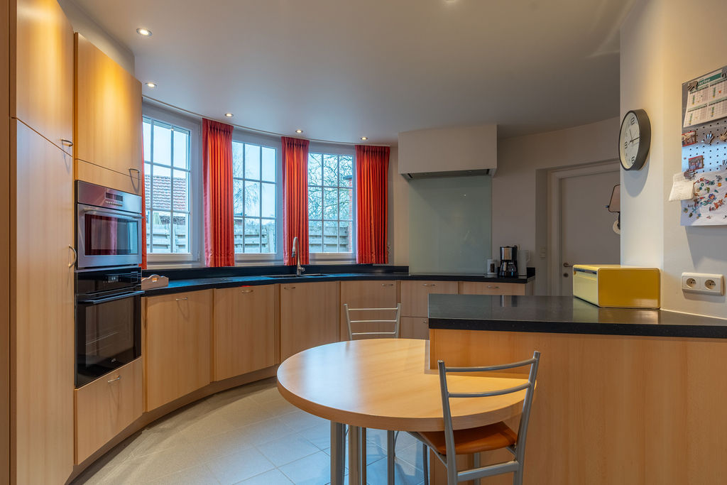 Aansluitend is er een volledig ingerichte keuken en een ruime ontbijtkamerkamer die uitgeeft op het overdekt terras, het terras en de tuin achteraan.