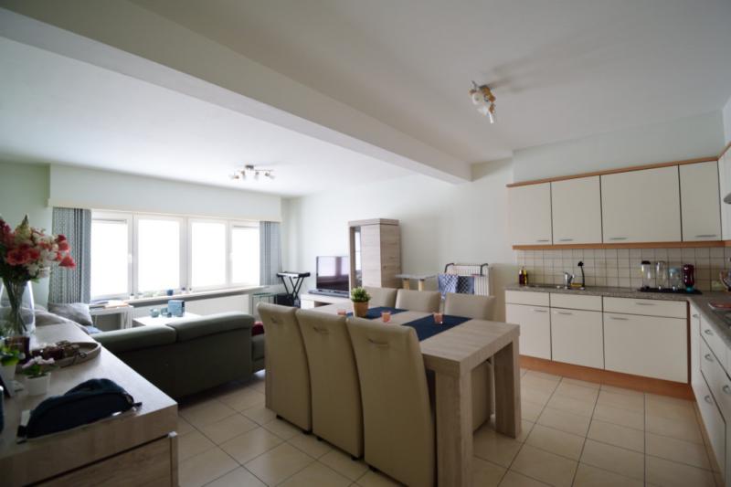 Het appartement bestaat uit een inkomhal, een mooie leefruimte met zithoek, eethoek en aanpalende open keuken. De keuken is ingericht met fornuis, afzuigkap en inbouw ijskast.