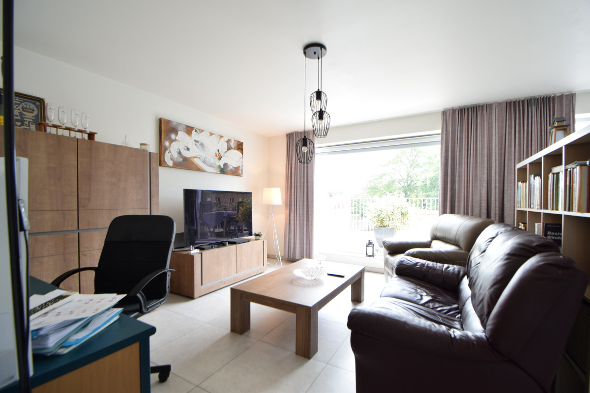 Het appartement (110mē) bestaat uit een inkomhal met afgesloten toilet die uitgeeft op een zeer ruime woonkamer met open keuken. De keuken is volledig ingericht en hoogwaardig afgewerkt (inductie fornuis, inbouwijskast, vaatwasser, oven, ) en is voorzien van een aparte diepvrieskast.