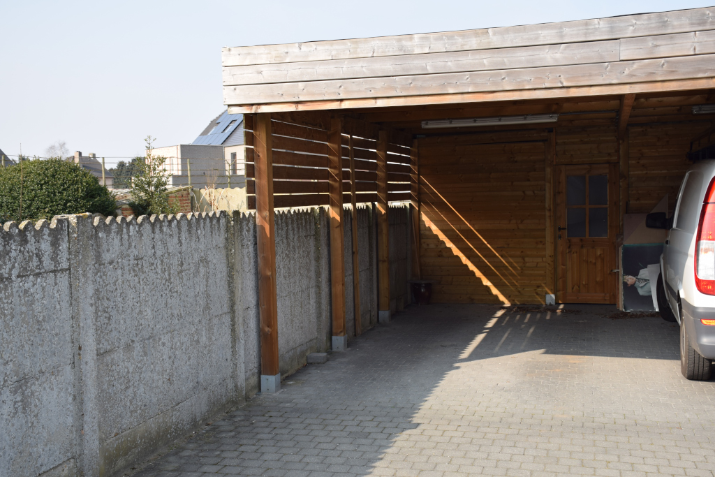 Achteraan is er een individuele overdekte staanplaats met grote individuele bergruimte, ter hoogte van de straatzijde is er een elektrische poort.