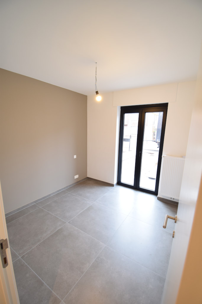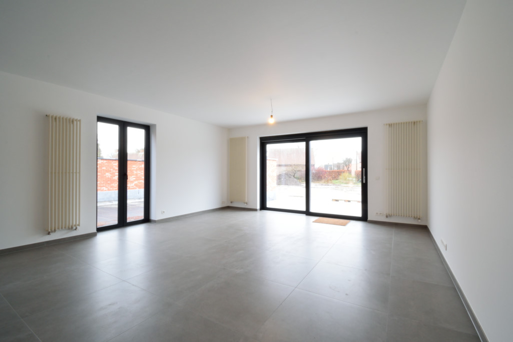 De leefruimte geeft via een schuifraam uit op het terras en de tuin achteraan. De tuin zal voorzien worden van kunstgras en zal volledig afgesloten worden en voorzien van een toegangspoortje.