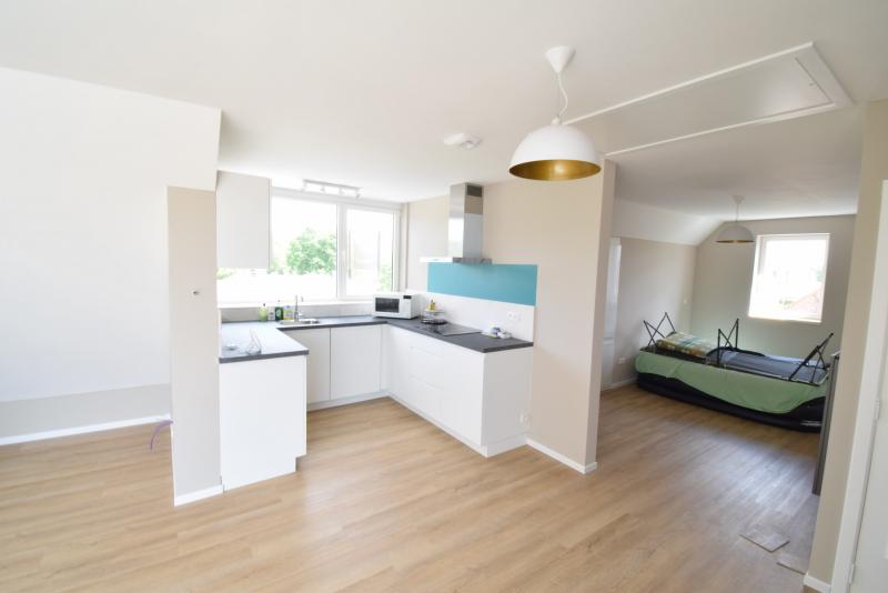 De open keuken is volledig ingericht (keramische kookplaat, afzuigkap, ijskast, oven en vaatwasser).