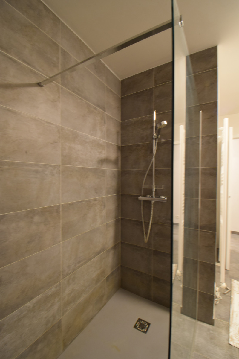 Achteraan is er een grote slaapkamer met aanpalend terras en een er een badkamer met lavabomeubel en grote inloopdouche.