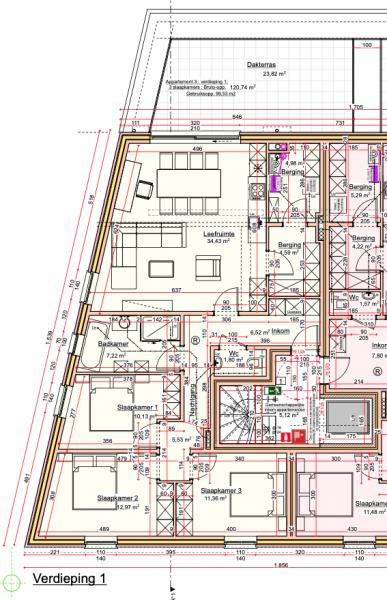 | Living | 34,43 m˛ | Leefruimte bestaande uit zit- en eethoek, open keuken en groot schuifraam naar het groot dakterras. |