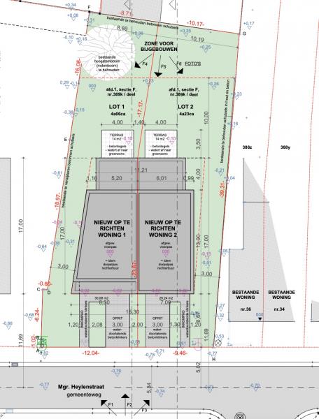Het perceel is geschikt voor het bouwen van een halfopen bebouwing met een gevelbreedte van 7 meter, bouwdiepte gelijkvloers 17 meter, 13 meter 1ste verdieping en 9 meter onder dak.