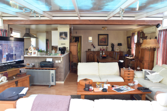 De bungalow bestaat uit een leefruimte met eet- en zithoek en aanpalend een volledig uitgeruste keuken. De leefruimte geeft via een schuifraam uit op hett terras aan de voorzijde.