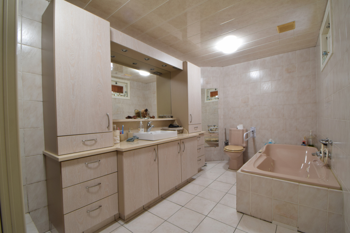 Aansluitend aan de keuken is er gelijkvloers een badkamer voorzien bestaande uit een badkamermeubel met lavabo, ligbad, toilet en douche. Achteraan is er een gelijkvloerse slaapkamer voorzien.