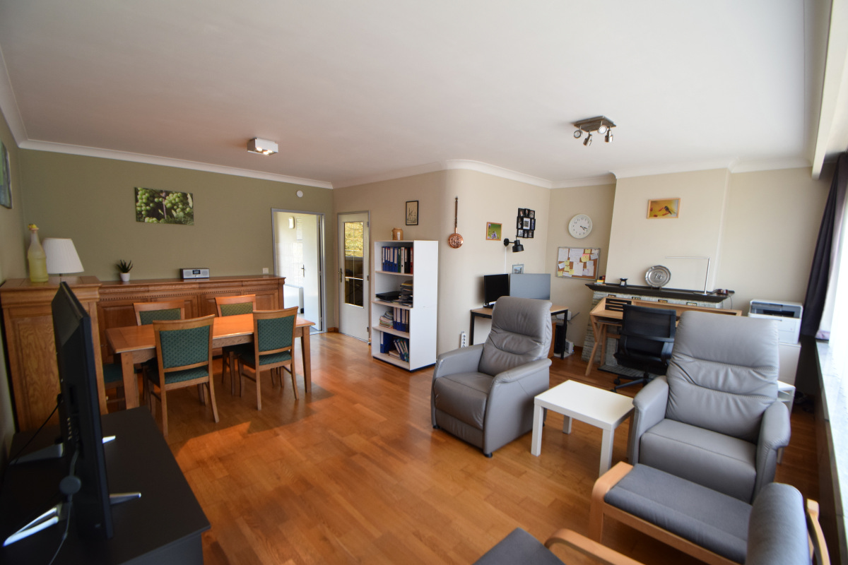 Op de eerste verdieping is er een kleine berging en apart toilet, de hal geeft uit op een leefruimte in L-vorm met bureauhoek op parketvloer. Aansluitend aan de leefruimte is een ingerichte keuken geplaatst die volledig is uitgerust met Miele-toestellen en beschikt over voldoende kastruimte. De keuken geeft uit op een terras met zicht op de tuin.